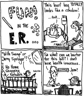 Hey, I was just in the ER recently, too, with barfing symptoms. The only thing I didn't puke in was that little puke condom. I put it on my head, and told Leslie it was a hat. We took it home.
